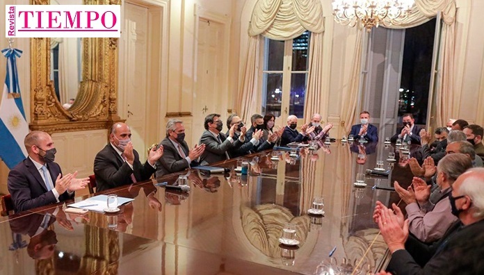 El presidente Alberto Fernández recibió a sindicalistas y patrones en la Casa Rosada y encabezó la firma del acuerdo que elevó el mínimo, apuntó que “es un primer paso para recuperar el valor que el salario perdió en 4.años del anterior gobierno” y explicó que “la forma de hacerlo es con los representantes de los trabajadores y las empresas”.