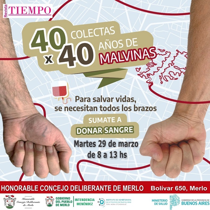 El Honorable Concejo Deliberante de Merlo junto al Instituto de Hemoterapia de la provincia de Buenos Aires “Dra. Nora Echenique” realizará el martes 29 de marzo de 8 a 13 hs. la primera jornada del año de donación de sangre en el marco de la Campaña 40 x 40 en conmemoración de la Guerra de Malvinas.