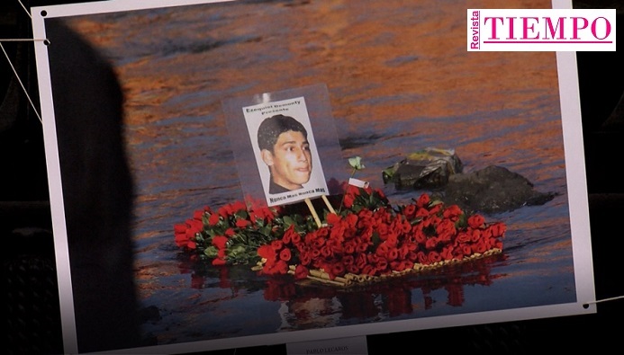 La muestra fotográfica montada frente al Parlamento porteño incluía imágenes de los rostros de varias víctimas de violencia institucional, entre ellas Miguel Bru y Camila Arjona.