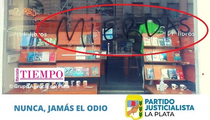 En redes sociales se compartieron imágenes donde se ven pintadas con aerosol algunas aberturas del edificio y la vidriera de la librería que funciona en el lugar, donde desconocidos escribieron la palabra “mierdas” en color negro y símbolos que tachaban las tradicionales simbologías peronistas.