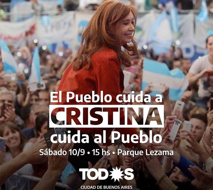 “El pueblo cuida a Cristina. Cristina cuida al pueblo. Este sábado a las 15 horas. Todos a Parque Lezama”, reza la convocatoria del FdT porteño realizada este miércoles a través de sus redes sociales.
