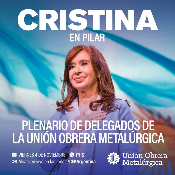 “Mañana -por este viernes- voy a participar del Plenario de delegados de la Unión Obrera Metalúrgica, al que fui invitada por el compañero Abel Furlán”, publicó la exmandataria en su cuenta oficial en Twitter.