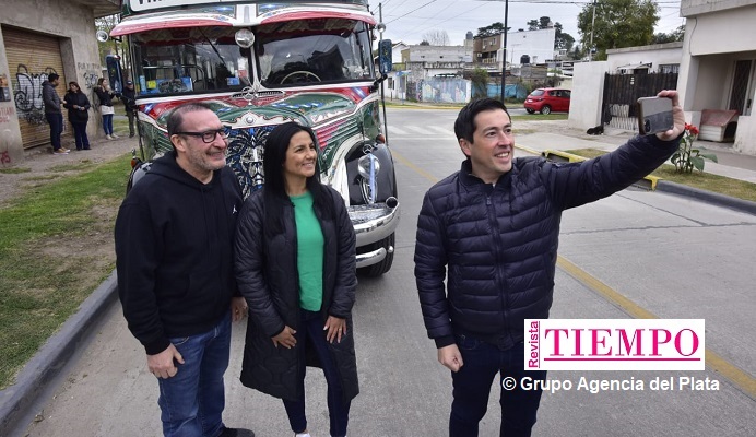 Los funcionarios recorrieron parte del tramo de Eva Perón que ha sido repavimentada, en un colectivo antiguo de la línea 371. Luego se realizó el habitual corte de cinta inaugural junto a familias mayenses.