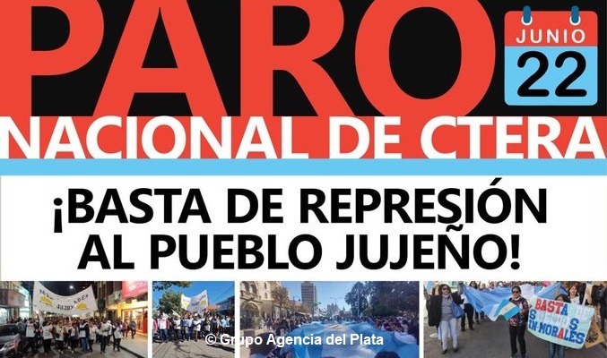 La Ctera convocó a un paro nacional docente para este jueves 22 de junio tras la represión en Jujuy. Explicó que la convocatoria se debe a “la grave situación que vive la docencia y el pueblo jujeño” y que reclamará por el cese de la “represión al pueblo jujeño”, un “aumento salarial a los docentes” y el rechazo a la “reforma constitucional” de esa provincia aprobada el viernes.