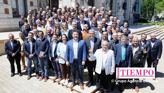 Tras el encuentro, Kicillof dio una conferencia de prensa en la que graficó que “fue una reunión con los 84 intendentes entrantes y salientes, para agradecer, para hacer un reconocimiento y un festejo en persona por el resultado de UxP”.
