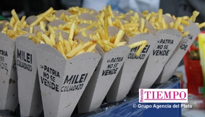 Los organizadores de la original movida se encomendaron a entregar a los transeúntes de la Plaza San Martín, esa que recibirá mañana al presidente para “festejar el Día de la Patria”, varios conos de papas fritas de forma gratuita. Los empaques llevaban escritas dos frases: la consigna “La Patria no se vende”, en referencia al frustrado Pacto de Mayo y al plan de gobierno de La Libertad Avanza en general; y el eslogan cordobés “Milei Culiadazo”, que también se transformó en tendencia en las redes sociales este viernes.