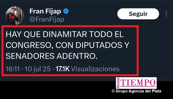 Por su parte, @ElTrumpista llamó a una “milicia popular armada” y difundió un video ficticio de una explosión en el recinto del Senado, mientras que Fran Fijap dijo que “hay que dinamitar todo el Congreso, con diputados y senadores adentro”.