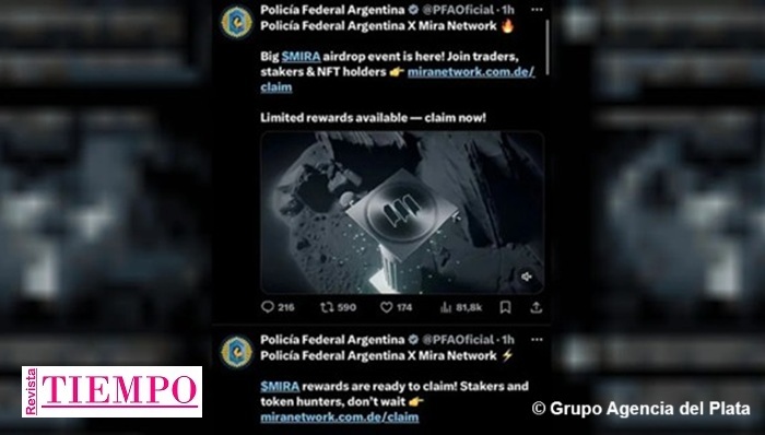 Las publicaciones mencionan: “Policía Federal Argentina Х Mira Network, Big $MIRA airdrop event is here! Join traders, stakers & NFT holders. Limited rewards available – claim now!”. Según se pudo ver se trataba de una criptomoneda con el nombre de $MIRA.
