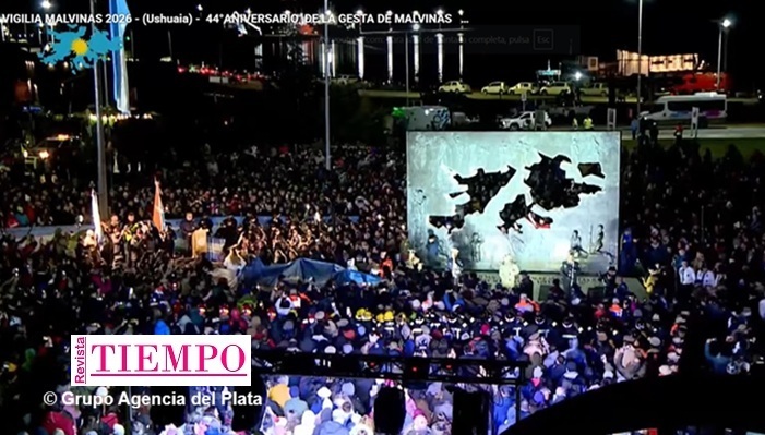 La comunidad de Tierra del Fuego, invitados especiales y autoridades, acompañan a los veteranos y sus familias en la vigilia del 2 de abril de 2026, en el “44° aniversario de la gesta de Malvinas”. En directo a través de la Televisión Pública Fueguina.